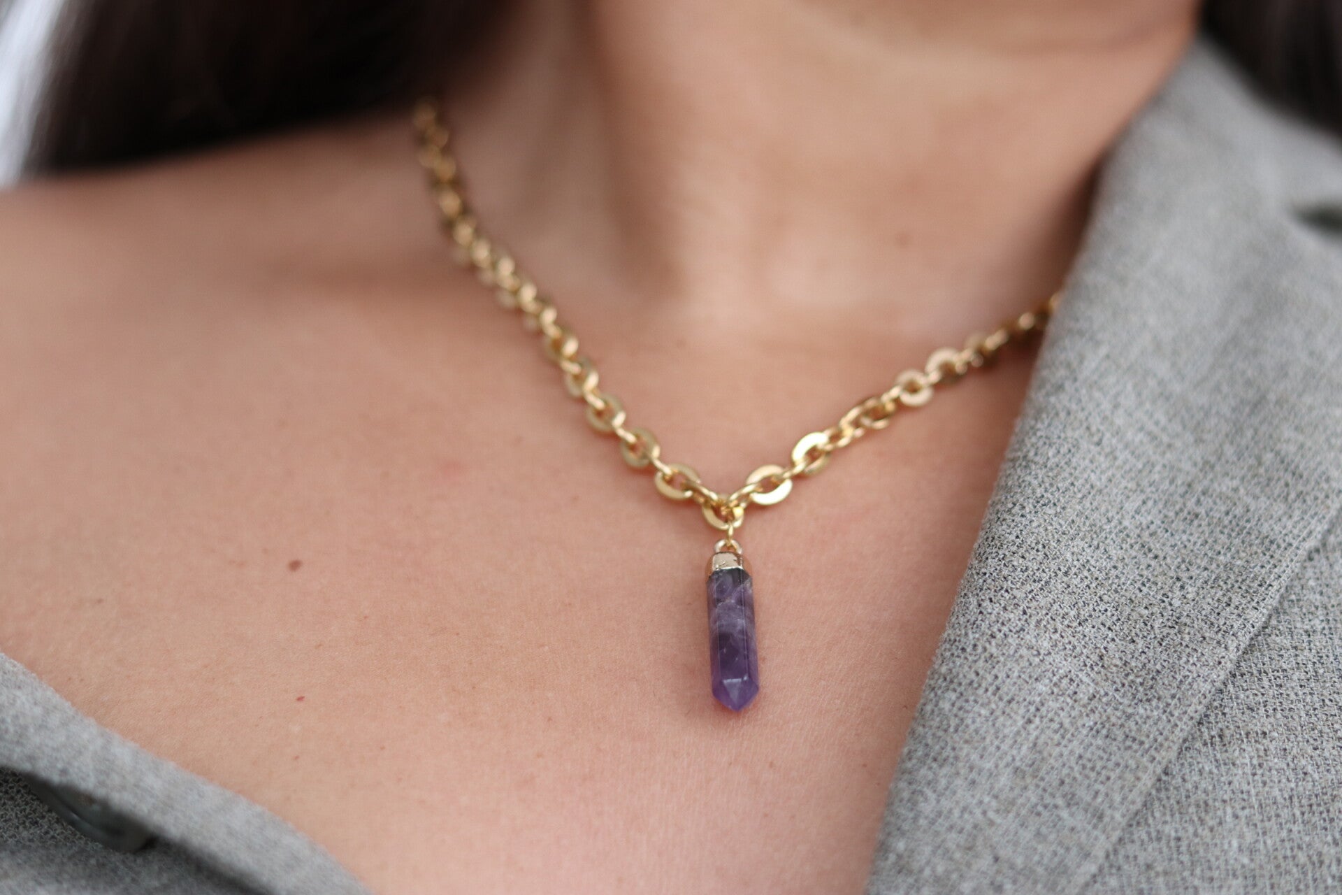 Deze mooie grovere geschakelde ketting met Amethist bedel is een prachtige blikvanger!